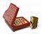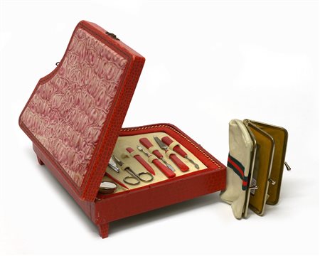 Lotto di due set da manicure, una a guisa di pianoforte con carillon sui toni del rosso e l'altro come un portamonete da viaggi in tela beige e banda verde/rossa a ricordare Gucci (difetti) Lotto di due set da manicure, una a guisa di pianoforte con carillon sui toni del rosso e l'altro come un portamonete da viaggi in tela beige e banda verde/rossa a ricordare Gucci (difetti) Lot comprising two manicure sets, one shaped like a pino with music box (defects)