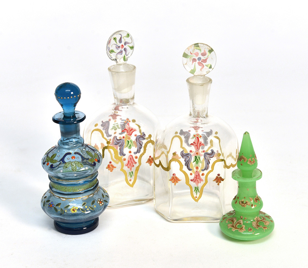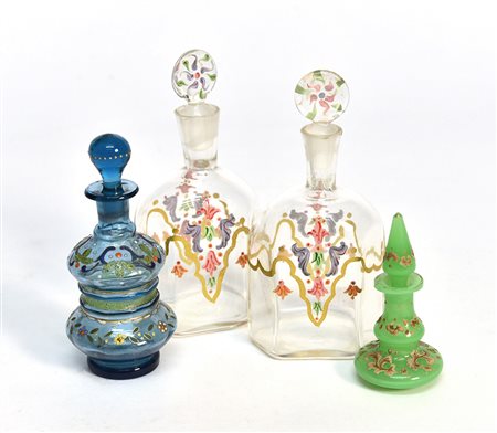 Lotto di quattro bottiglie porta profumo diverse in vetro e opaline decorate a freddo con motivi vegetali