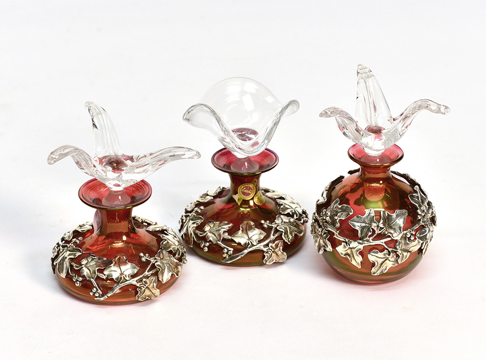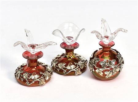 Lotto di tre boccette in vetro colorato rosso con rifiniture in metallo