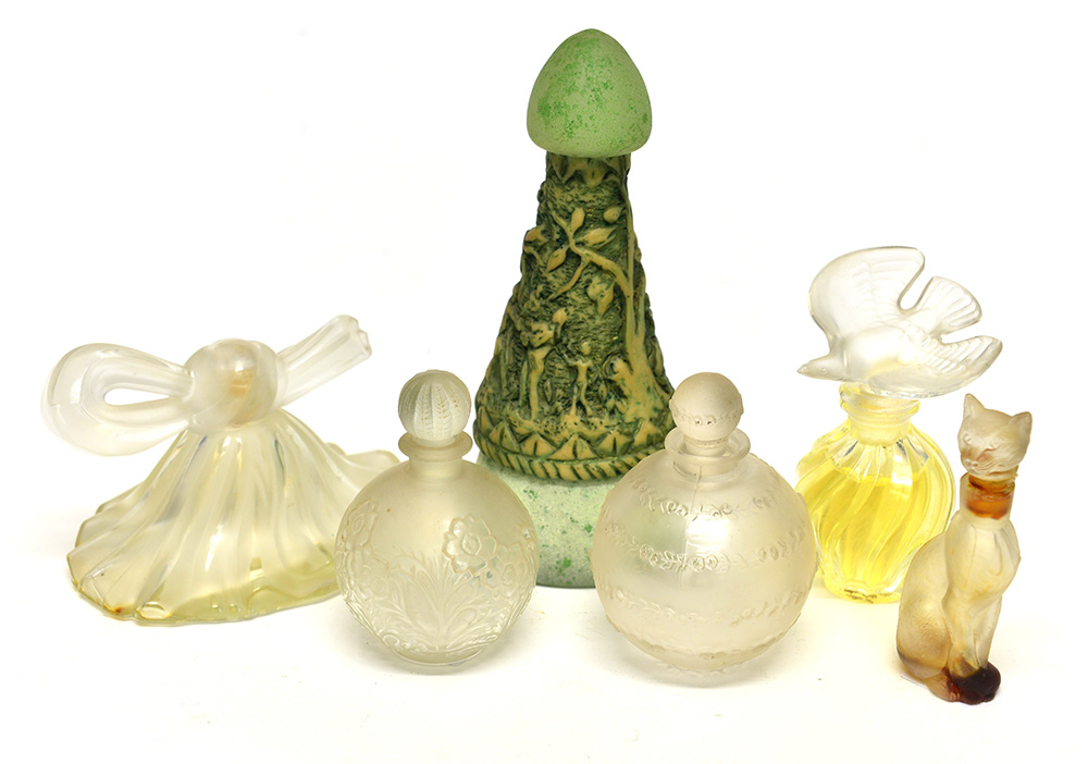 Lotto composto da sei bottiglie di diversa epoca e forma in vetro e opaline una marcata Lalique (difetti)