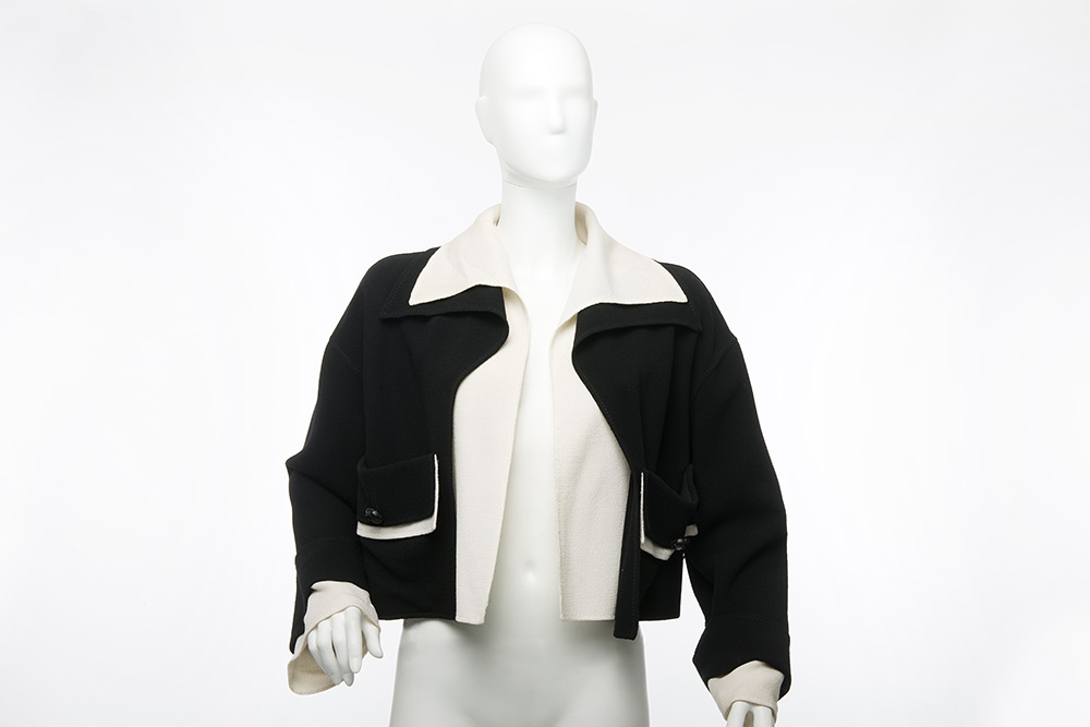 Valentino: giacca corta in crÈpe di lana double-face color nero e bianco con tasche frontali, tg 8 (lievi difetti) A black and white short jacket, size 8 Valentino: giacca corta in crÈpe di lana doppia color nero e bianco, due tasche frontali, tg 8 (lievi difetti) A black and white short jacket, size 8