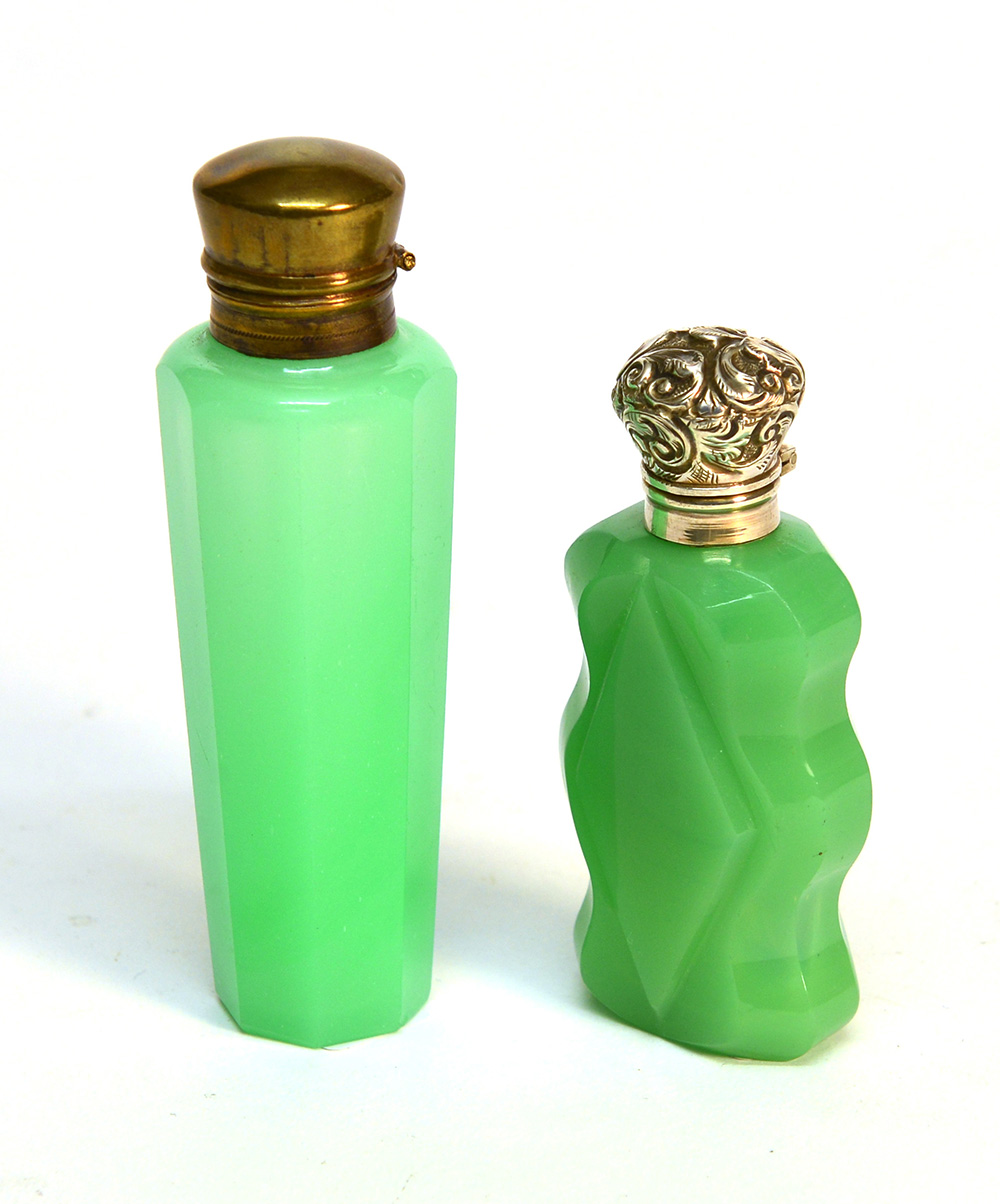 Lotto composto da due portaprofumi in vetro opalino a fondo verde con ghiere in argento e metallo ( h. cm. 10)