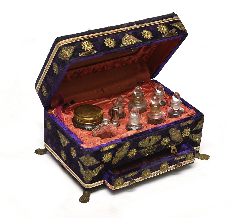 Cofanetto da viaggio in metallo e velluto viola con piedi a zampa leonina, cassetto porta gioie e spazio vanity, completo di boccette (difetti e mancanze) Cofanetto da viaggio in metallo e velluto viola con piedi a zampa leonina, cassetto porta gioie e spazio vanity, completo di boccette (difetti e mancanze) Metal and purple velvet travel cosmetic case (defects and losses)
