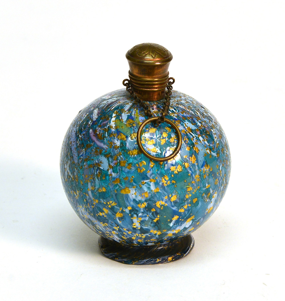 Manifattura del sec. XIX bottiglia portaprofumo in vetro azzurro soffiato decorato a dorature, ghiere in metallo dorato (h. cm. 10)