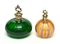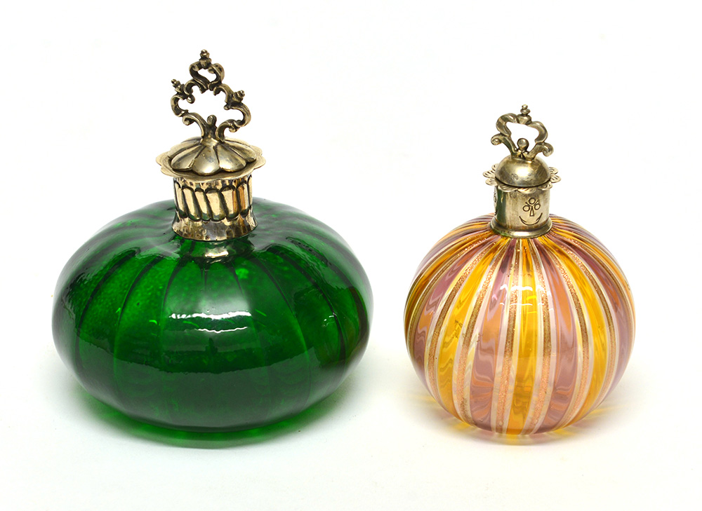 Manifattura di Murano lotto composto da due bottiglie portaprofumo in vetro verde e in vetro striato ghiere in metallo argentato