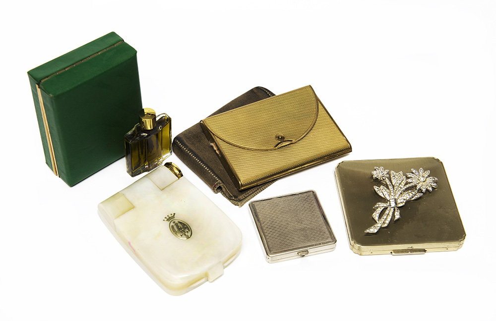 COTY Lotto di quattro portacipria e un profumo ìEmeraudeî di forme, dimensioni e materiali differenti, un portacipria rifinito in strass, un'altro in custodia originale con il profumo (lievi difetti)