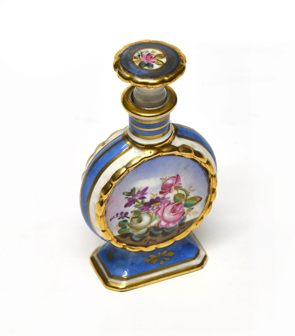 Manifattura francese fine sec. XIX. Bottiglia portaprofuma in porcellana decorata in policromia a rose. Profili dorati