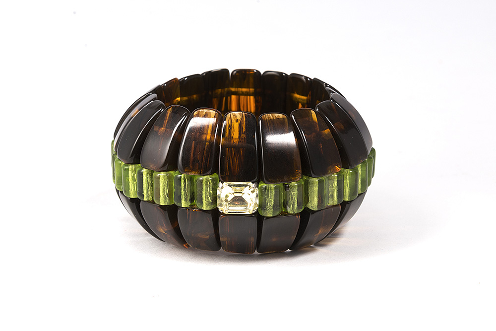 PAOLO BELLINI Braccialetto elastico composto da elementi semisferici in simil tartaruga con inserti verde mela e strass