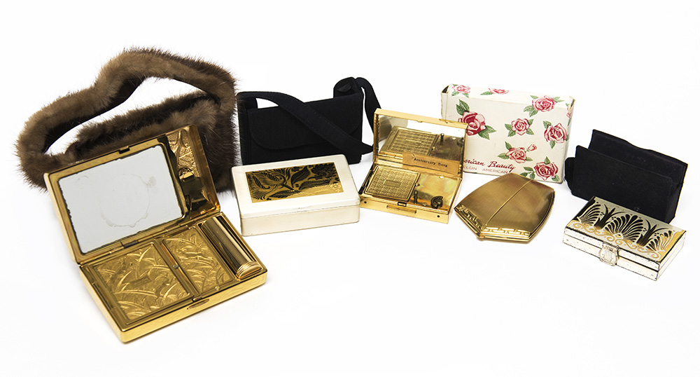 ELGIN AMERICAN Lotto composto da tre portacipria e due vanity cases dei quali uno con custodia in pelliccia di visone e uno in faille nero, due con carillon (difetti) ELGIN AMERICAN Lotto composto da tre portacipria e due vanity cases dei quali uno con custodia in pelliccia di visone e uno in faille nero, due con carillon (difetti) Lot comprising five compacts of which two with fitted mink carrying carrying case, one with black faille carrying case and two with music boxes (defects)