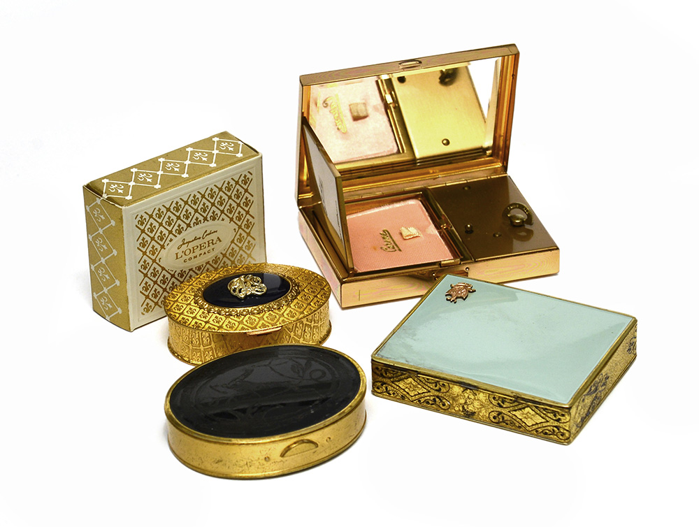 BLISS, A6ME, JACQUELINE COCHRAN ñ Lotto di quattro portacipria di cui uno con carillon in metallo color oro, smalti, forme, lavorazioni e dimensioni diverse, una con confezione originale (difetti) BLISS, A6ME, JACQUELINE COCHRAN ñ Lotto di quattro portacipria di cui uno con carillon in metallo color oro, smalti, forme, lavorazioni e dimensioni diverse, una con confezione originale (difetti) Lot comprising four compacts in different colours and sizes, one with music box (defects)