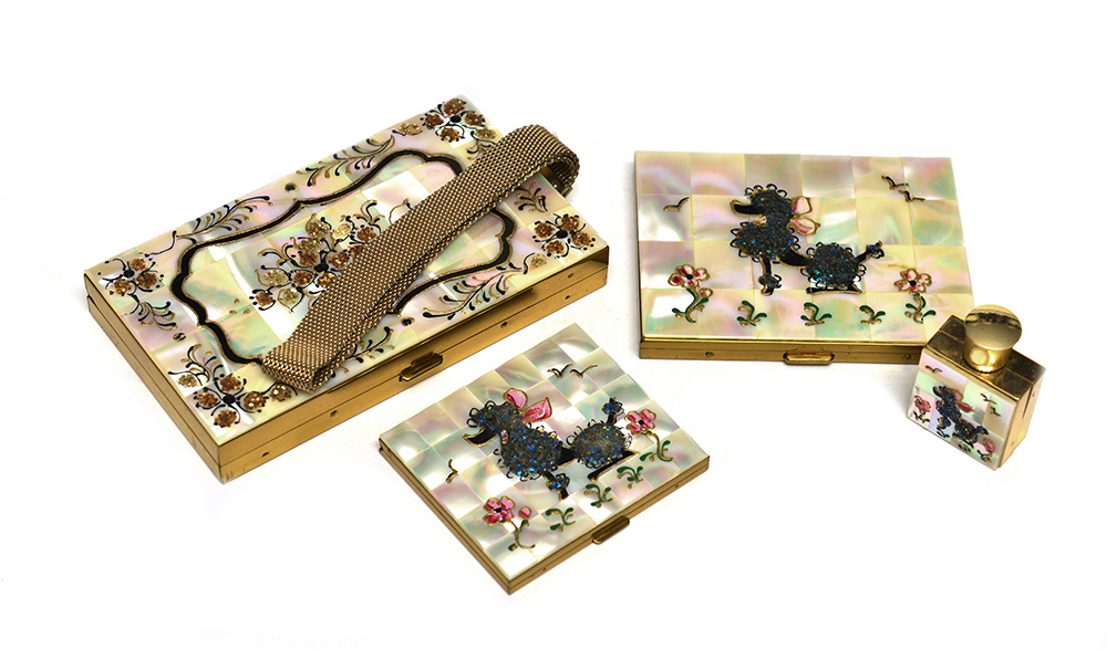 MAHILL ñ Lotto composto da portacipria, porta profumo, porta sigarette e vanity case, tutti in metallo color oro, rivestimento in madreperla, tre dei quali con disegno a rilievo di barboncino con smalti e pietruzze, il vanity con manico e decoro floreale negli stessi materiali MAHILL ñ Lotto composto da portacipria, porta profumo, porta sigarette e vanity case, tutti in metallo color oro, rivestimento in madreperla, tre dei quali con disegno a rilievo di barboncino con smalti e pietruzze, il vanity con manico e decoro floreale negli stessi materiali Lot comprising two compacts, a sigarette case and a perfume holder