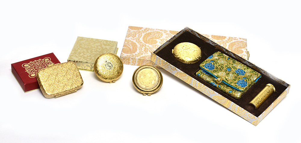 REVLON ñ Lotto di tre portacipria e una confezione con portacipria, rossetto e mini bag in tessuto lamÈ, i portacipria in metallo color oro e diversamente lavorati come la forma e le dimensioni, uno con cammeo color avorio. Due in astuccio originale REVLON ñ Lotto di tre portacipria e una confezione con portacipria, rossetto e mini bag in tessuto lamÈ, i portacipria in metallo color oro e diversamente lavorati come la forma e le dimensioni, uno con cammeo color avorio. Due in astuccio originale Lot comprising four compacts, two with original boxes
