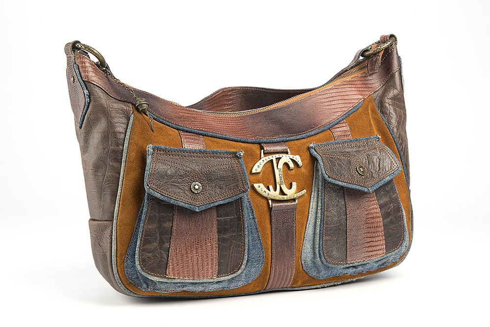 JUST CAVALLI Borsa a tracolla in pelle stampata coccodrillo e pitone sui toni del marrone. Crosta color terra di Siena e inserti in jeans, particolari in metallo come il logo con strass in ottone invecchiato. Con sacchetto originale (cm 37) (livi difetti)