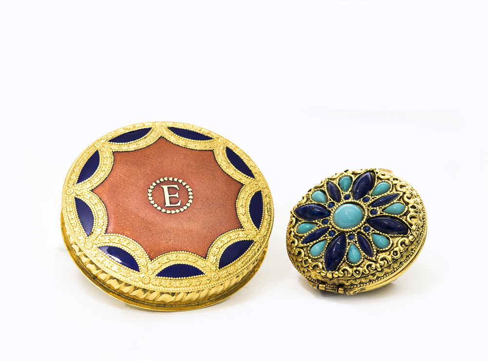 MAX FACTOR, EVE ñ Lotto di due portacipria in metallo color oro, il primo rifinito in pasta di lapislazzuli e turchesi e l'altro con malti blu e color corallo, entrambi in confezione originale MAX FACTOR, EVE ñ Lotto di due portacipria in metallo color oro, il primo rifinito in pasta di lapislazzuli e turchesi e l'altro con malti blu e color corallo, entrambi in confezione originale Lot comprising two compacts both with original boxes