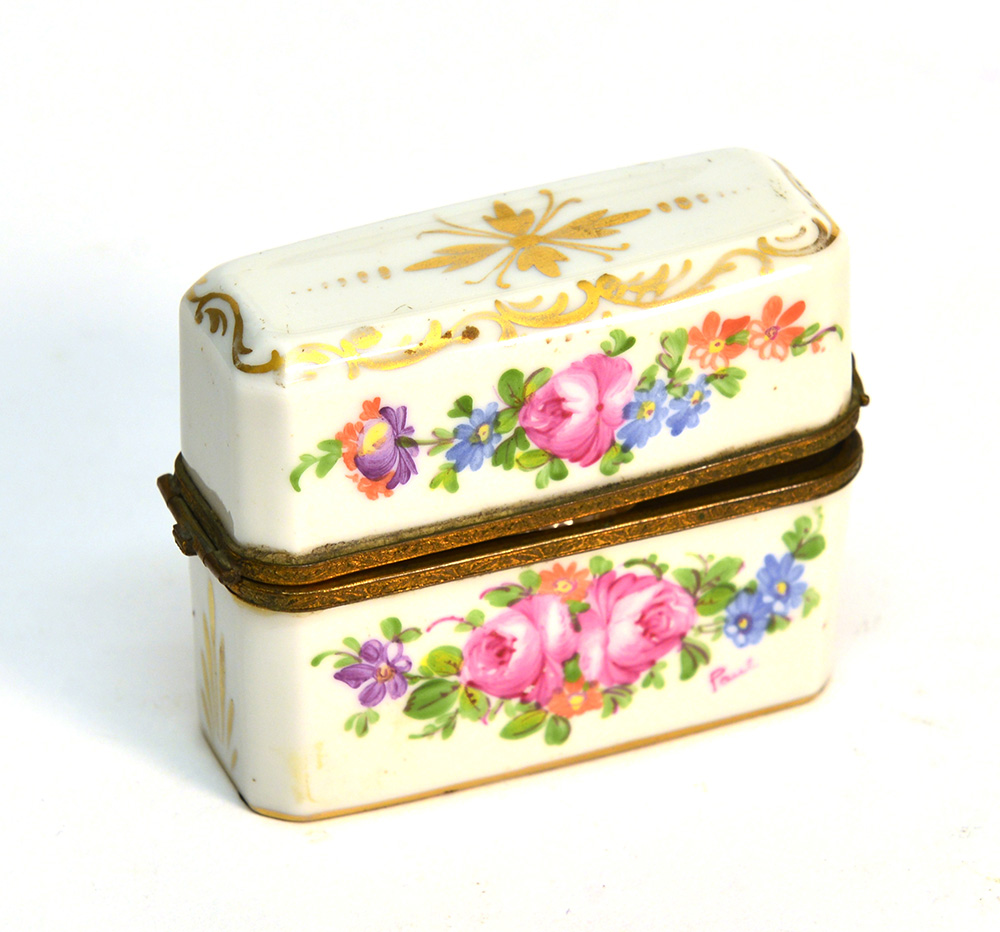 LIMOGES ñ scatolina in porcellana e metallo (?) decorata a fiori contenente...