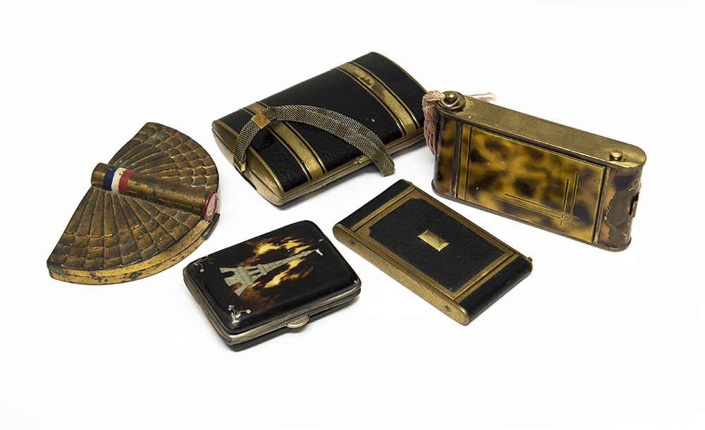 Lotto di cinque tra portacipria, portamonete e vanity, una con manico e una...