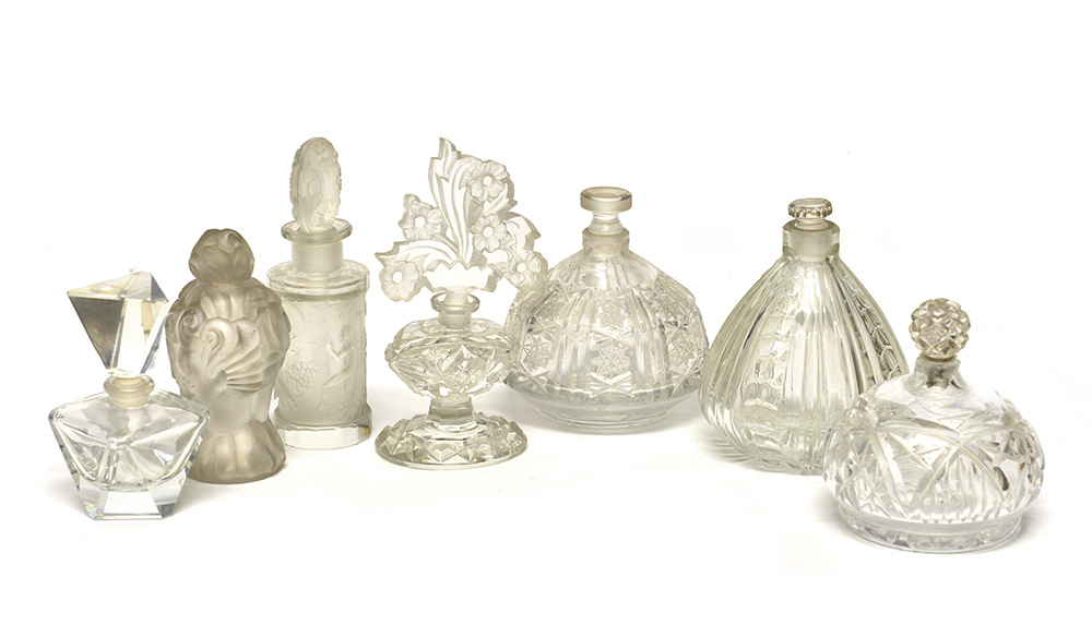 Lotto di sette bottiglie in vetro e cristallo, due decorate in rilievo a motivi liberty e dÈco