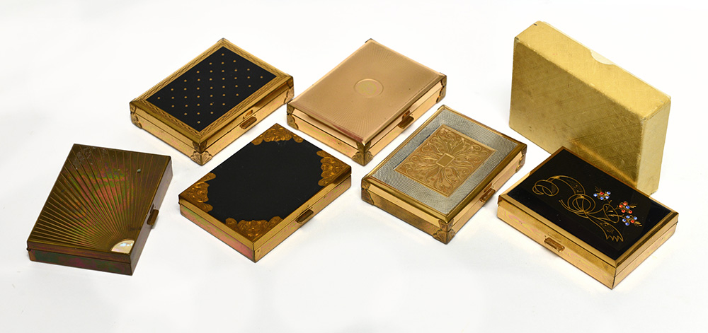 A6ME ñ Lotto di sei portacipria rettangolari con carillon in metallo color oro e una color argento, alcune con smalto nero, strass e madreperla (lievi difetti) A6ME ñ Lotto di sei portacipria rettangolari con carillon in metallo color oro e una color argento, alcune con smalto nero, strass e madreperla (lievi difetti) Lot comprising six rectangular compacts some with music box (minor defects)