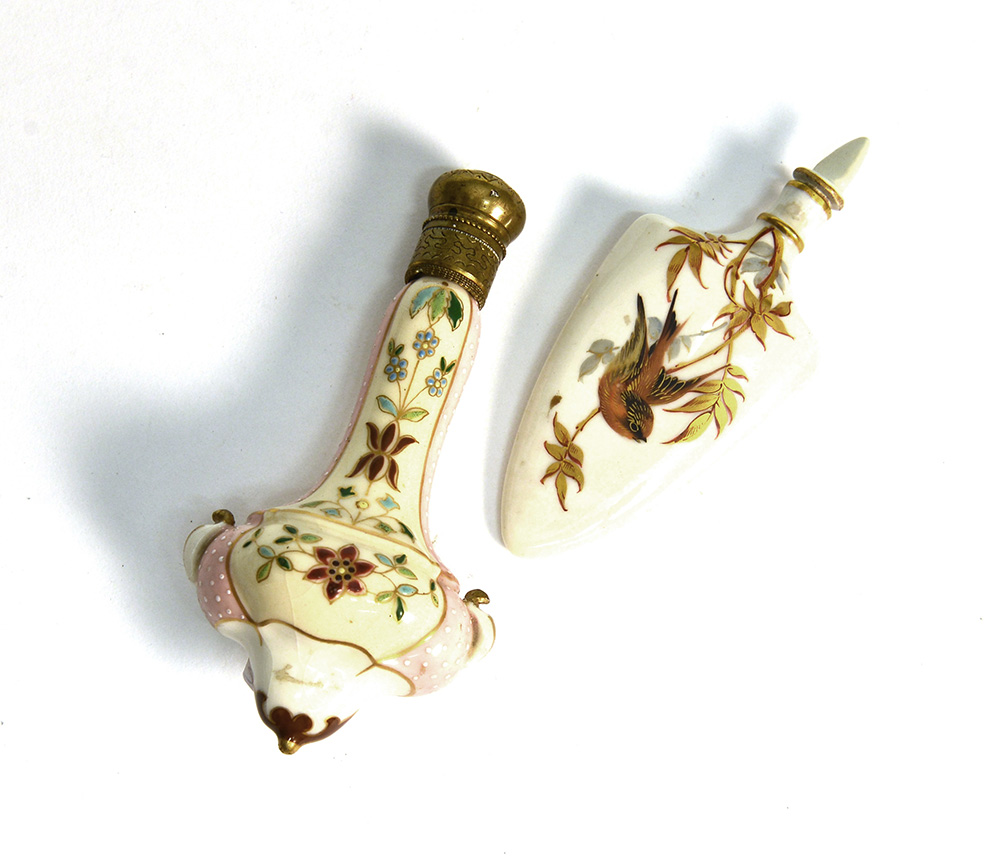 Lotto di due bottigliette diverse in porcellana decorata a fiori e volute, secolo XIX