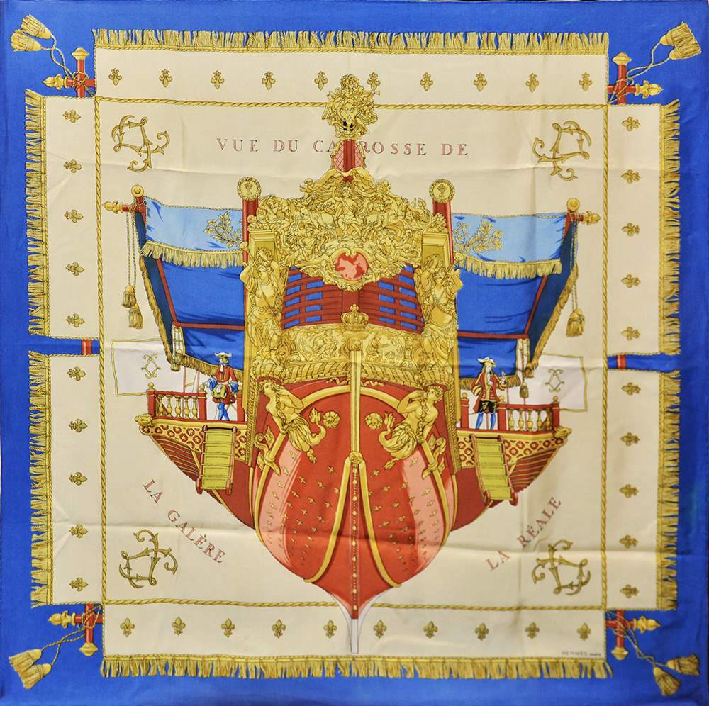 HERMES Foulard in seta "La GalËre RÈale", Hugo Grygkar, fondo avorio, bordo blu cina (difetti)
