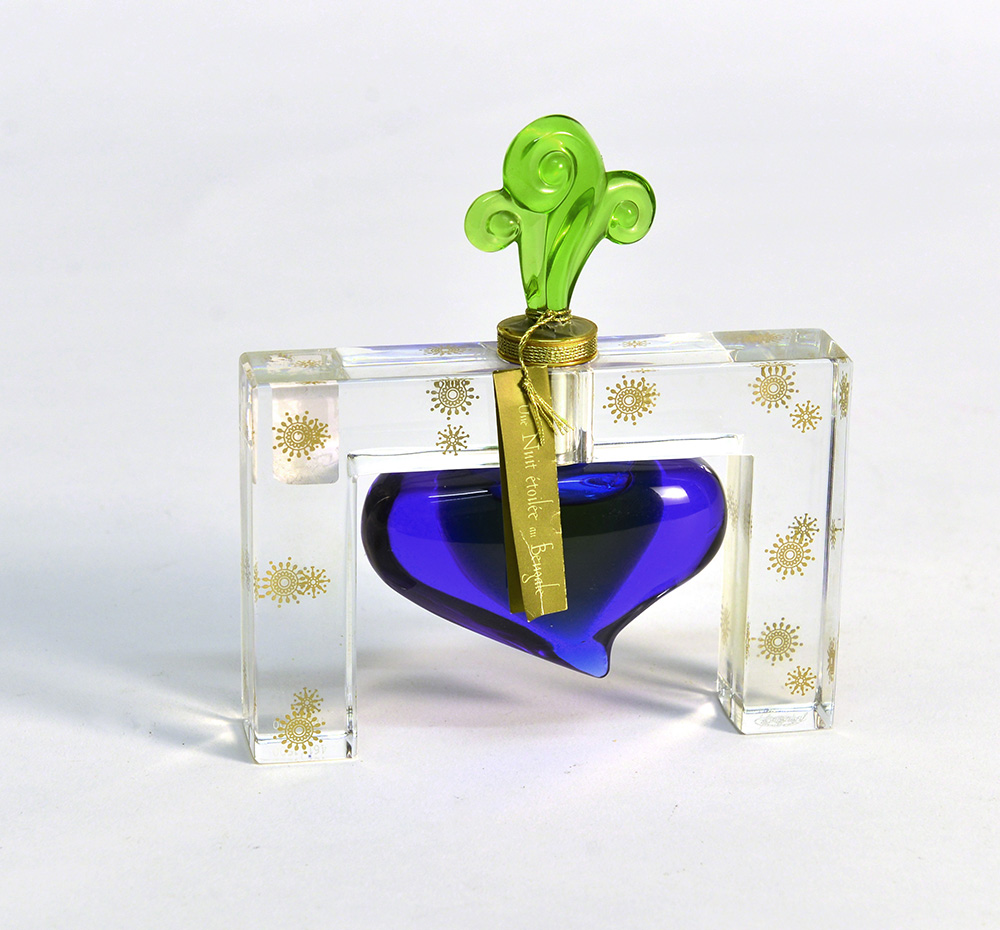 BACCARAT "Une Nuit EtoilÈ Bengale", ampolla a forma di cuore di colore blu notte con tappo in vetro satinato verde sorretta da una struttura di vetro ialino a guisa di ponte