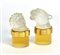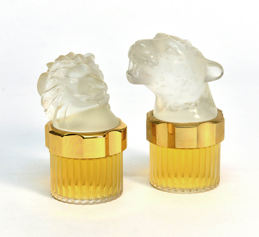 LALIQUE ñ Lotto di due bottiglie di profumo nuove in vetro satinato con testa di leone e di pantera ( 9653, 3D03) cm 13-15