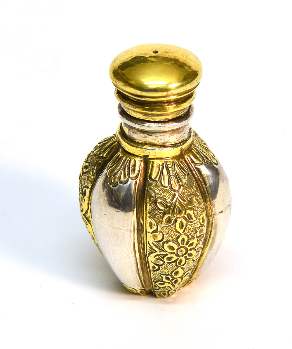 Boccetta porta profumo in argento e oro con corpo costolato decorato a fiori, secolo XIX