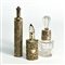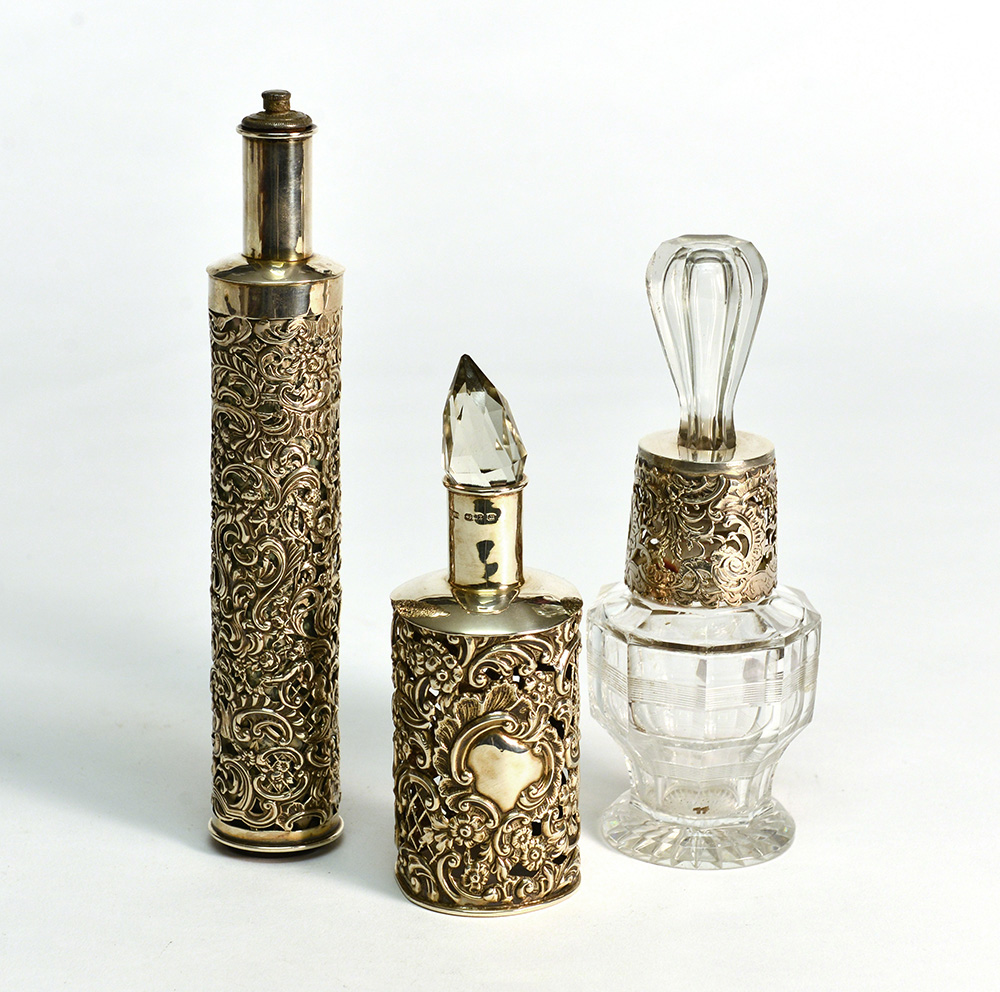 Lotto di tre bottiglie diverse in cristallo ialino inciso con tappo e rifiniture in argento (un vetro mancnate)