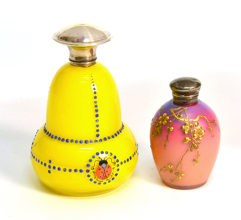 Lotto composto da due bottigli portaprofumo in vetro giallo e rosato decorate a freddo rami fioriti e coccinelle. Una con ghiera e tappo in argento. Inizio sec.XX