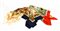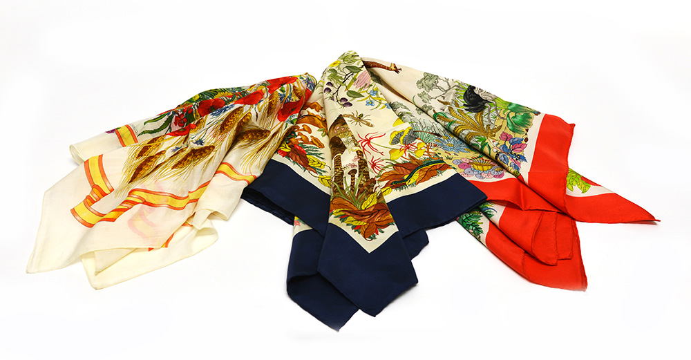 GUCCI (Accornero): Lotto composto da tre foulard: due in seta e uno in cotone stampa flora e fauna in colori vari, bordi color blu, rosso e avorio (difetti)