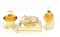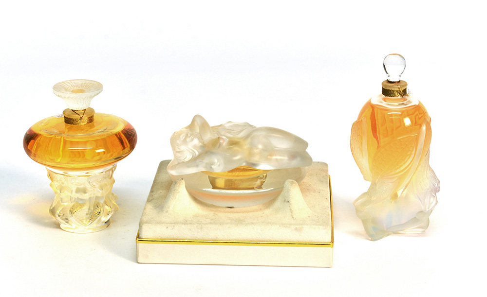 LALIQUE ñ Lotto di tre bottiglie di profumo nuove in vetro ialino satinato e non con varie raffigurazioni di donne tra le quali sirene cm 6-14,5 (1F15, 0G03, 8F14 con numerazione del vetro A721)