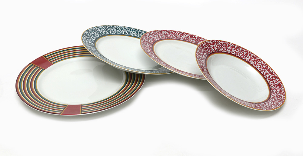 HERMES Set di quattro piatti "Attelage" composta da sottopiatto, piatto piano, piatto da minestra e piatto da frutta