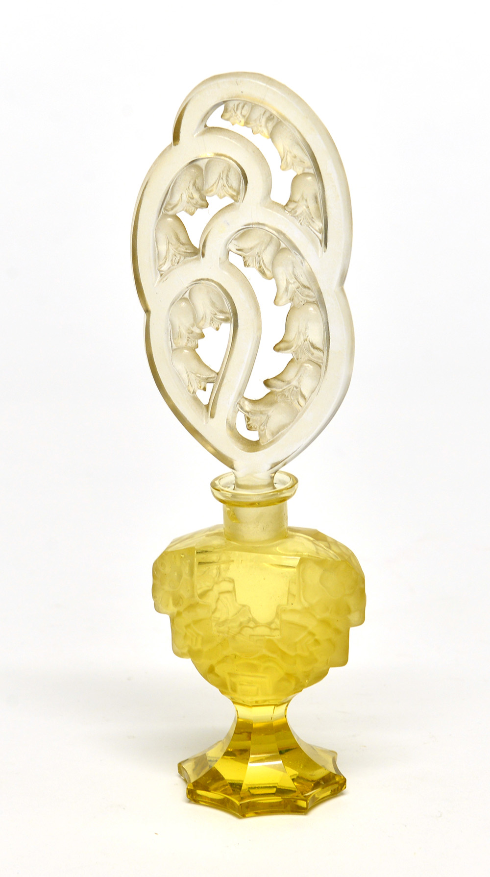 Manifattura di Moser Francia 1930 circa, bottiglia portaprofumo in vetro decorato all'acido a fiori. Tappo traforato e decorato a campanule (h. cm. 24)