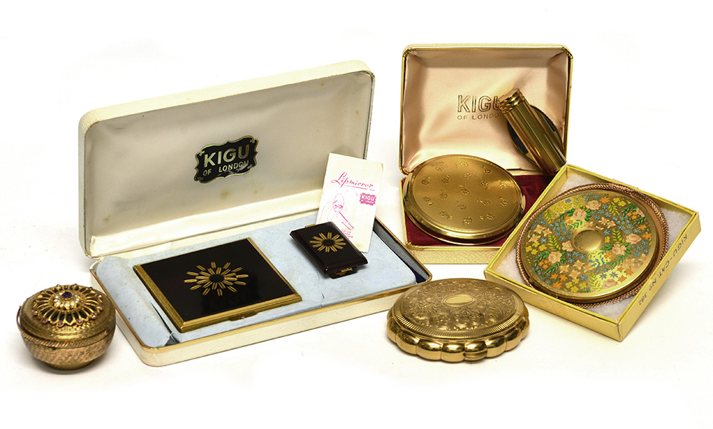 KIGU ñ Lotto di cinque portacipria di cui due con rossetto e specchio in confezione originale, tutti in metallo color oro, varie forme, dimensioni e lavorazioni, rifiniti con smalti e strass KIGU ñ Lotto di cinque portacipria di cui due con rossetto e specchio in confezione originale, tutti in metallo color oro, varie forme, dimensioni e lavorazioni, rifiniti con smalti e strass Lot comprising five compacts some with original boxes