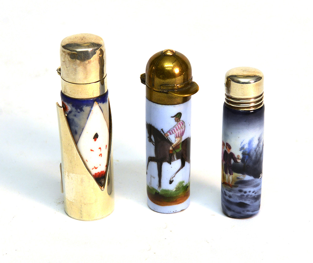 Lotto di tre boccette porta profumo in in ceramica e smalti, una decorata con fantino e tappo a forma di cap.