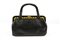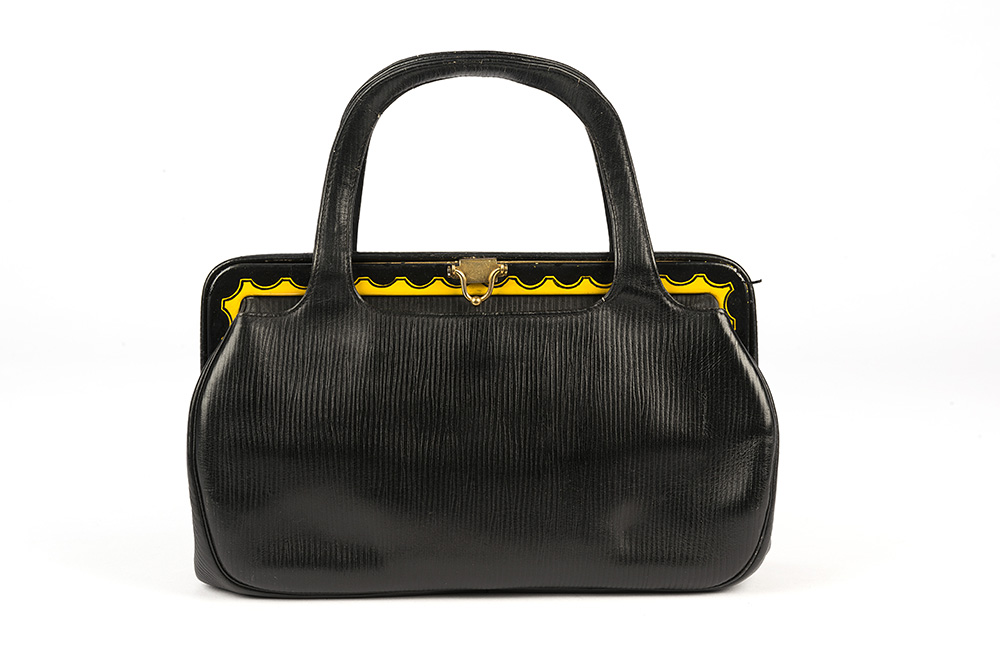 ROBERTA DI CAMERINO Borsetta a doppio manico in pelle lavorata nera con chiusura a scatto in metallo color ottone, motivo decorativo in giallo, con sacchetto originale (cm 25)