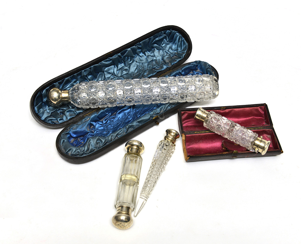 Lotto composto da quattro bottiglie porta profumo in cristallo molato, due piccole con apertura bifrontale, e una a cono, alcune con tappi e ghiere in argento e una in custodia in cuoio originale