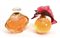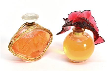 LALIQUE ñ Lotto di due bottiglie di profumo nuove in vetro incolore satinato e non una ad ampolla con tappo a farfalle violacee e líaltra con raffigurazione di bacio e telaio in metallo dorato satinato cm 11- 12 (0B01, 9C16 vetri numerati A0C1 e C432)