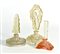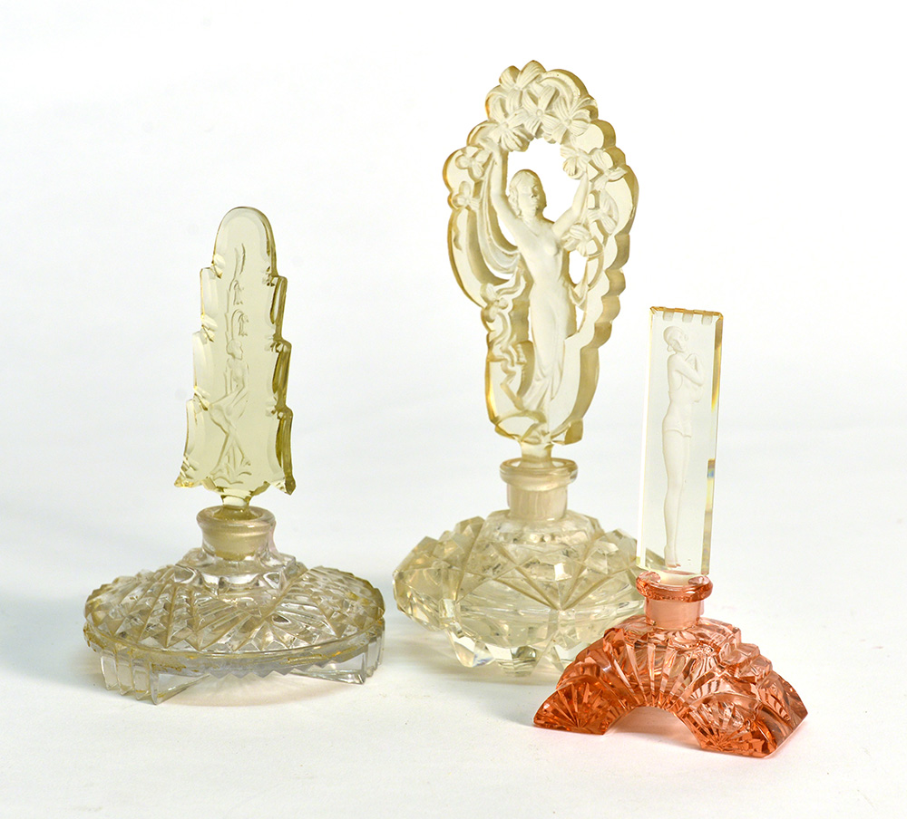 Lotto di tre bottiglie in cristallo molato con tappi decorati e traforati a figure femminili, Cecoslovacchia, 1930 ca.