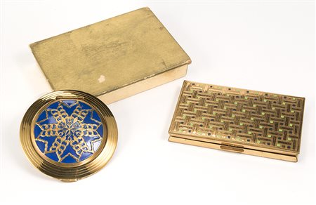 RICHARD HUDNUT Lotto di due vanity cases e un portacipria di cui uno in confezione originale, tutte in metallo color oro e rifinite con smalti nei toni del blu e del verde (lievi difetti) RICHARD HUDNUT Lotto di due vanity cases e un portacipria di cui uno in confezione originale, tutte in metallo color oro e rifinite con smalti nei toni del blu e del verde (lievi difetti) Lot comprising three compacts, one with original box (minor defects)