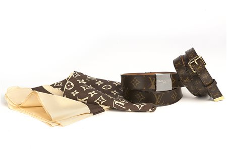 LOUIS VUITTON Lotto di due cinture in tela Monogram e vacchetta e un foulard...