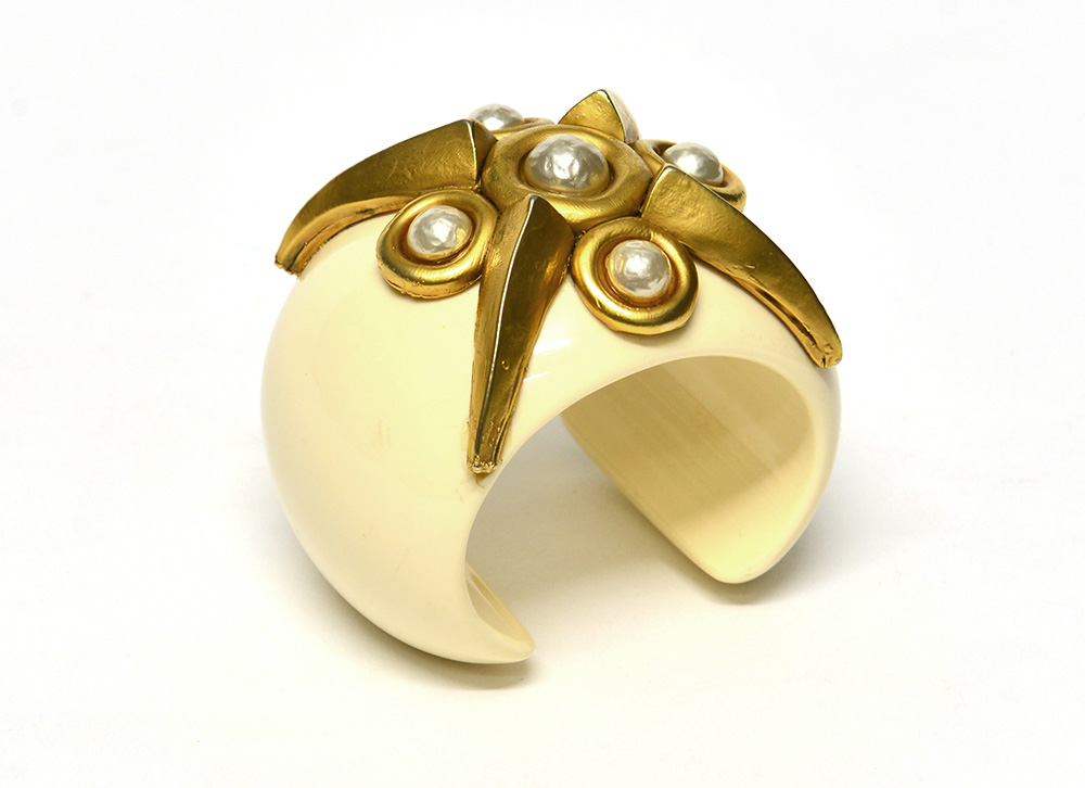 CHANEL Importante bracciale alla schiava color avorio decorato con grande stella color oro e perle fancy