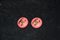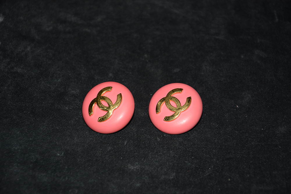 CHANEL Paio di orecchini a clips in materiale plastico color rosa intenso con logo color oro in rilievo (lievi difetti)
