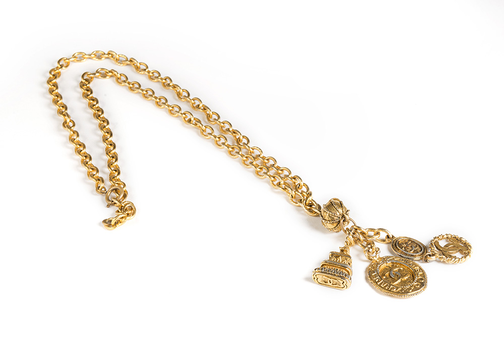 CHANEL Collana a catena in metallo color oro con charms pendenti (lievi difetti)