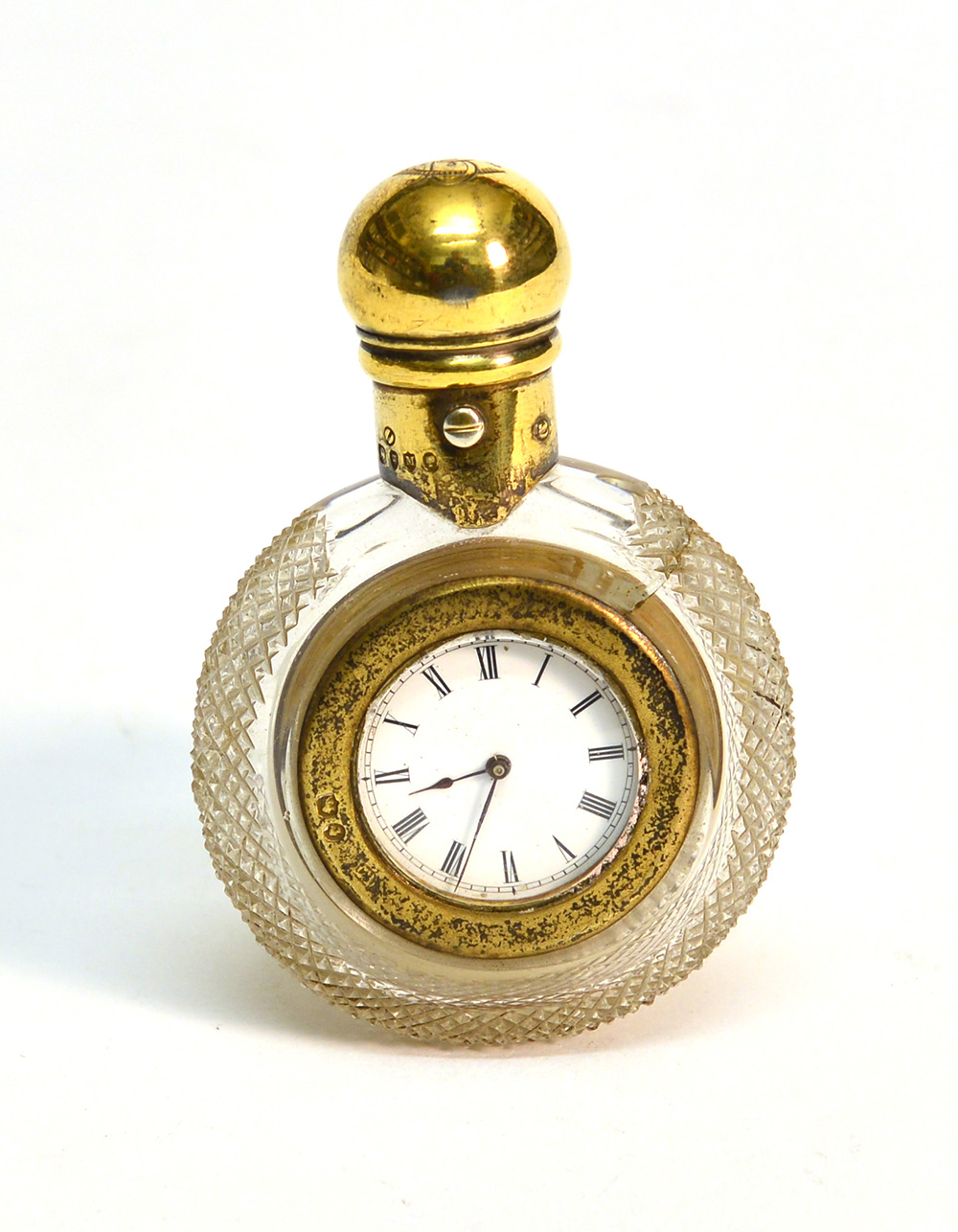 Boccetta porta profumo in vetro di forma tonda con corpo decorato da orologio con quadrante a smalti e numeri romani. Inghilterra, secolo XX (difetti)