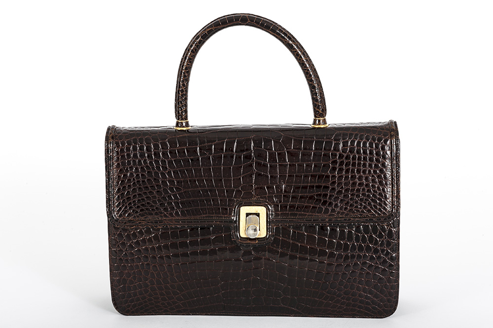 Pirovano: borsa in coccodrillo color cioccolato, con manico stondato, chiusura in metallo dorato, interno scamosciato color miele, largh. cm 33, in sacchetto originale (difetti). Pre-Convenzione Cites Pirovano: a chocolate brown crocodile handbag (defects). Pre-Cites Agreement