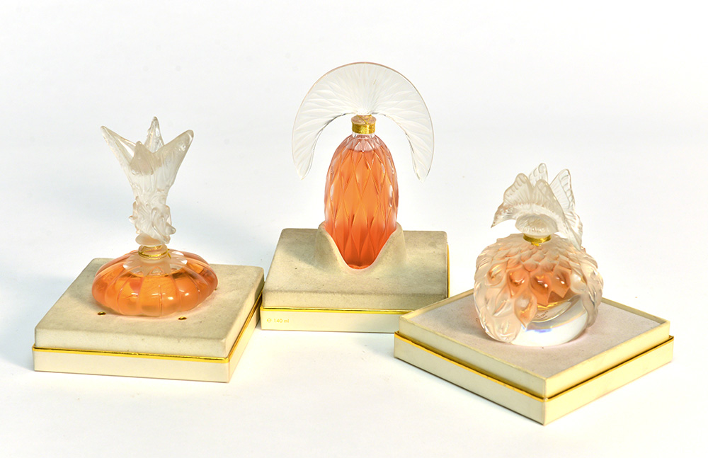 LALIQUE ñ Lotto di tre bottiglie di profumo nuove, in vetro ialino e satinato con figure di farfalle su fiore, angeli e ananas stilizzato (2H03, 6EAC3, 5d01) cm 12- 17