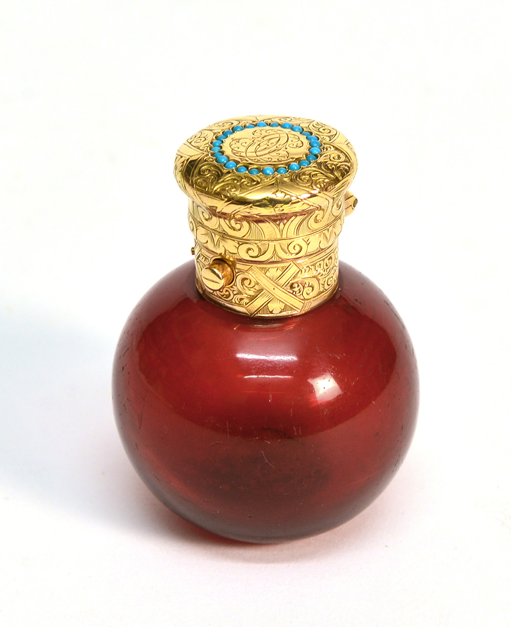 Boccetta portaprofumo in vetro color rosso con tappo e ghiera in oro incise volute fogliate e motivi geometrici. Tappo decorato con perlinature in pasta di turchese. Fin se. XIX (h. cm. 7)