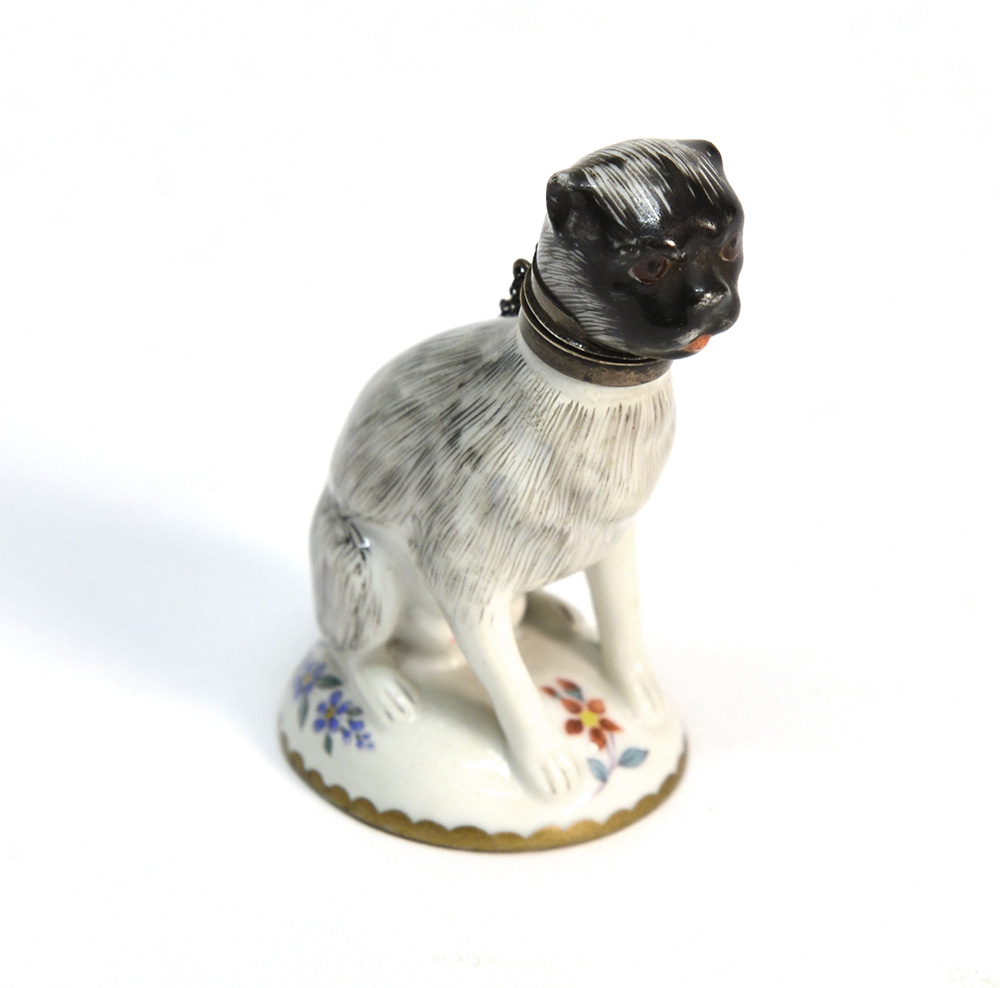 Boccetta porta profumo in metallo smaltato in policromia a forma di mastino. Francia , secolo XIX