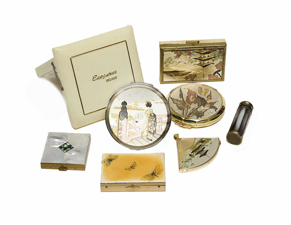 ELEGANCE, TORERO, PINK LADY E ANONIMI Lotto di tre portacipria, un vanity case, un portapillole, un porta rossetto e uno specchietto da borsetta, uno in scatola originale, tutti di ispirazione orientale per decoro e intarsi (difetti) ELEGANCE, TORERO, PINK LADY E ANONIMI Lotto di tre portacipria, un vanity case, un portapillole, un porta rossetto e uno specchietto da borsetta, uno in scatola originale, tutti di ispirazione orientale per decoro e intarsi (difetti) Lot comprising four compacts, a pill box, a lipstick holder and a hand mirror (defects)